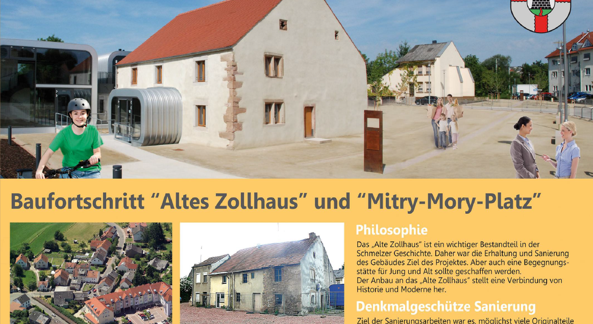 Der gesamte Vorbereich einschließlich der Marktstraße wird optisch durch die Wahl der verwendeten Materialien zusammengefasst. Auf diese Weise erhält der zuvor rein auf die Verkehrsfunktion reduzierte Straßenraum eine attraktive dorftypische Gestalt. Einzig und allein die als Intarsie in den Platzbelag eingelassene, im kräftigen Farbton des Schmelzer „Rötelgesteins“ angelegte historische Achse leitet den Blick vom Zollhaus in Richtung Primsufer zur ehemaligen Brücke. Die reduzierte Platzmöblierung sowie das Baumdach aus Platanen verleihen dem Platz seinen schlichten französischen Charakter.